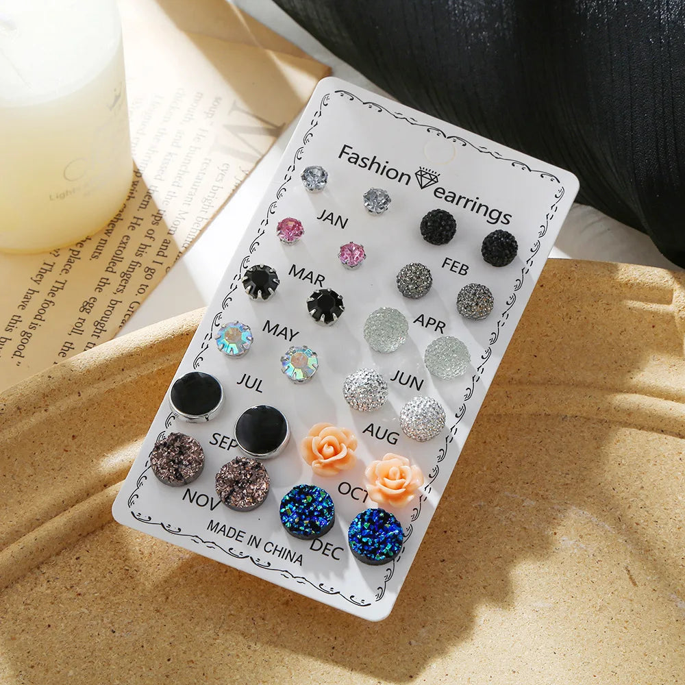 12 Pairs Assorted Crystals Druzy Stone Resin Stone Round Stud Earrings Set