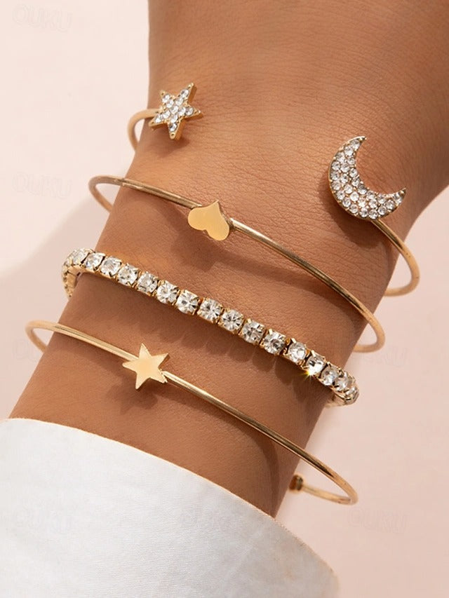 Elevate your accessory collection with this versatile four-piece bracelet set featuring celestial-inspired designs. Each piece showcases delicate star and moon motifs crafted with attention to detail, perfect for layering or wearing individually. The simple yet sophisticated aesthetic complements any style, from casual everyday wear to special occasions. Lightweight and comfortable for all-day wear, these bracelets offer an effortless way to express your personal style while maintaining an understated elegance that transcends seasonal trends.