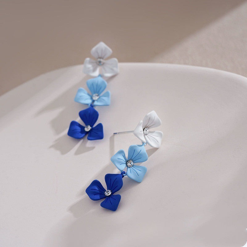 Klein Blue Color Gradient Flower Drop Earring Elevate your jewelry collection with these sophisticated drop earrings, featuring a striking Klein blue gradient that transitions seamlessly into delicate floral detailing. The gradient effect creates dimensional depth, while the flower motif adds an artistic touch that complements both contemporary and classic aesthetics. Lightweight construction ensures comfortable all-day wear, making these earrings ideal for professional settings, special occasions, or everyday elegance. The rich blue palette offers versatility—pairing ef